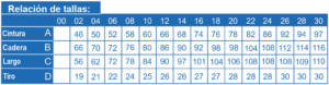 | Tallas | 00, 02, 04, 06, 08, 10, 12, 14, 16, 18, 20, 22, 24, 26, 28, 30 |